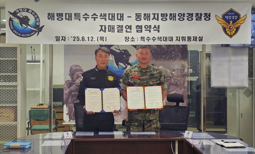 (동해=연합뉴스) 유형재 기자 = 동해지방해양경찰청과 해병대 특수수색대대는 12일 해병 1사단 내 특수수색대대에서 구조 전문인력 양성과 상호 공동 발전을 위한 업무협약을 맺었다.