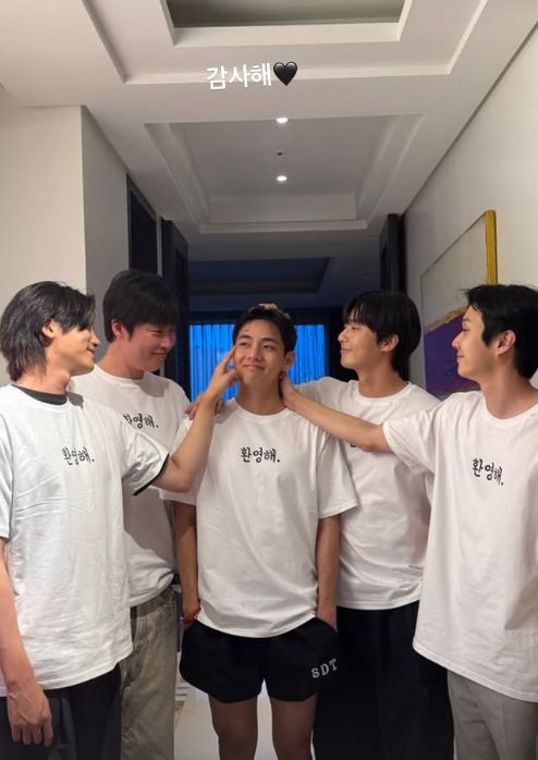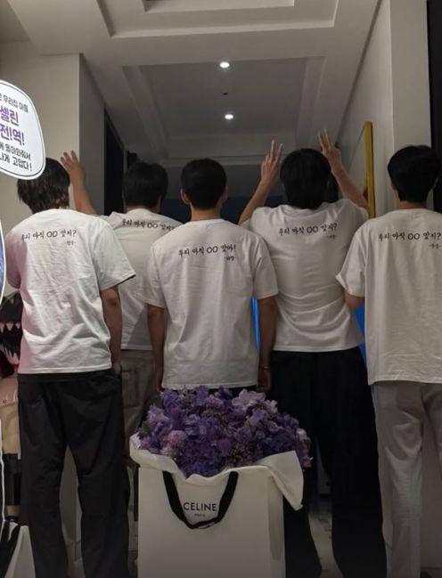 또 다른 사진에서는 이들의 뒷모습이 담겼다. 박서준, 박형식, 최우식, 픽보이는 "우리 아직 OO 맞지?"라는 문구가 적힌 티셔츠를 입고 뷔가 가운데에서 "우리 아직 OO 맞아!"라고 적힌 티셔츠를 입고 있어 유쾌함을 더했다.