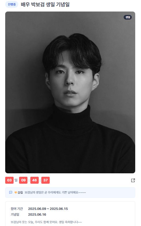 이처럼 극 중 활약이 이어지는 가운데, 박보검의 생일(6월 16일)을 기념한 온라인 이벤트가 디시트렌드에서 지난 9일부터 15일까지 진행 중이다. '배우 박보검 생일 기념일'이라는 제목으로 마련된 이번 행사는 팬들이 직접 축하 메시지를 남기며 함께 생일을 기념하는 공간으로 운영되고 있다.