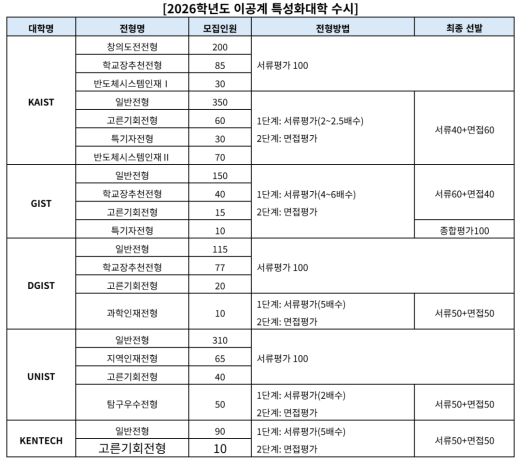 대구경북과학기술원(DGIST)은 222명을 모집한다. 일반전형 115명, 학교장추천전형 77명, 고른기회전형 20명, 과학인재전형 10명으로 구성된다. 일반·추천·고른기회 전형은 서류 100%로 선발하고, 과학인재전형은 서류와 면접을 각각 50% 반영한다. 반도체공학과는 올해 학교장추천전형으로도 선발한다.
