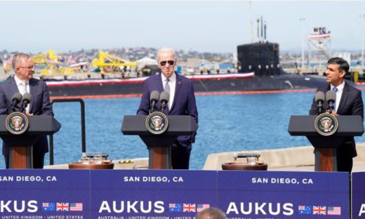 앤서니 앨버니지 오스트레일리아 총리, 조 바이든 전 미국 대통령, 리시 수낙 전 영국 총리가 지난 2023년 3월14일 미국 샌디에이고의 포인트로마 미 해군기지에 정박한 미주리 핵잠수함 앞에서 오커스안보협정을 발표하고 있다. AP 연합뉴스 |