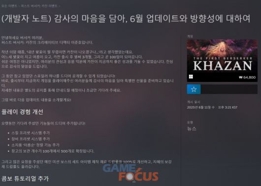 국내 및 글로벌 시장에서 좋은 평가를 받고 있는 넥슨의 신작 ‘퍼스트 버서커 : 카잔(이하 카잔)’의 개발을 이끌고 있는 이준호 디렉터가 개발자 노트를 통해 향후 게임의 업데이트 내용을 공개했다.