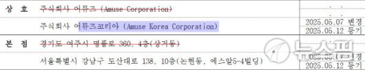 어뮤즈가 지난 달 12일 사명을 '어뮤즈코리아'로 변경하는 등기 절차를 모두 마무리했다. [사진=어뮤즈코리아 법인 등기 캡처] |