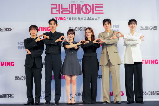 배우 윤현수, 이정식, 홍화연, 김지우, 최우성, 이봉준이 제작발표회에서 사진을 찍고 있다. 티빙 제공 |
