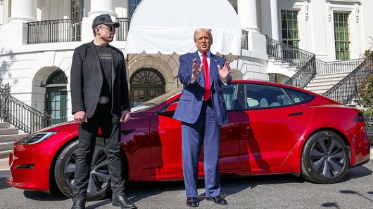 지난 3월 도널드 트럼프 미 대통령(오른쪽)과 일론 머스크가 트럼프가 구입한 테슬라 차량 앞에서 언론에 발언하고 있다. 로이터=연합뉴스 |