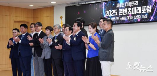 12일 오후 국회 의원회관에서 열린 '2025 콘텐츠미래포럼' 참석자들이 기념촬영 하고 있다.