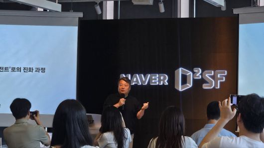 김상범 네이버 검색플랫폼 리더가 12일 서울 서초구에 위치한 네이버 D2SF 강남 사옥에서 네이버의 AI 검색 전략에 대해 발표하고 있다. /사진=비즈워치 |