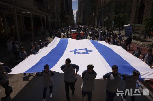 [뉴욕=AP/뉴시스] 18일(현지 시간) 미국 뉴욕의 맨해튼 5번가에서 열린 ‘이스라엘의 날'(Israel Day on 5th) 퍼레이드에 참가자들이 대형 이스라엘 국기를 들고 행진하고 있다. '이스라엘의 날' 퍼레이드는 뉴욕에서 미국 내 유대인 공동체와 이스라엘의 연대를 강조하기 위해 열리는 연례행사이다. 2025.05.19. |
