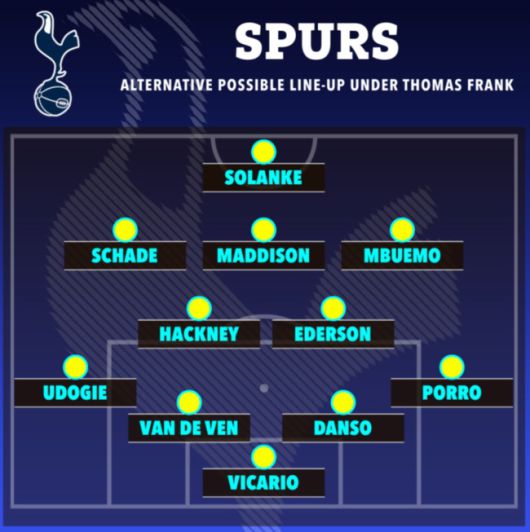 프랭크 감독이 다음 주면 공식적으로 토트넘 감독이 될 것으로 보이는데 이에 따라 여름 이적시장 영입도 진행될 것이다. 영국 '더 선'은 토트넘이 프랭크 감독 아래에서 꾸릴 수 있는 베스트 일레븐을 예상했다. 최전방에는 브렌트포드 소속 요안 위사였고 그 밑을 마티스 텔, 에베레치 에제, 타일러 디블링이 받쳤다. 3선은 모르텐 히울만, 루카스 베리발이었고 포백은 데스티니 우도기, 미키 판 더 펜, 마크 게히, 페드로 포로였으며 골키퍼는 굴리엘모 비카리오였다.