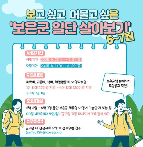 '보은군 일단 살아보기'는 관광객이 일정 기간 보은에 머물며 자유롭게 여행하고, 그 경험을 SNS 등에 홍보하면 실비를 지원하는 체험형 홍보 프로그램이다.
