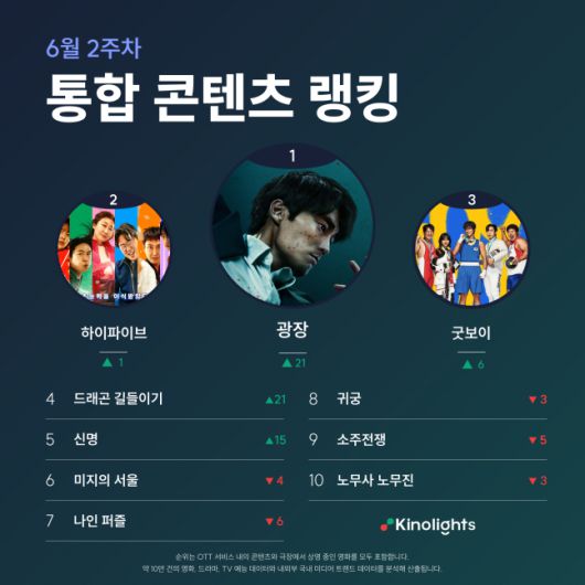 OTT 콘텐츠 통합 검색 플랫폼 키노라이츠가 6월 2주차(6/2~6/8) 통합 콘텐츠 랭킹을 공개했다. 6월 둘째 주 주간 콘텐츠 랭킹은 넷플릭스 시리즈 [광장]이 1위를 차지했다.