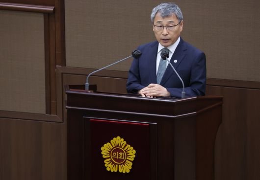 정근식 서울시교육감이 지난 10일 서울 중구 서울시의회에서 열린 331회 정례회에서 시정연설을 하고 있다. 연합뉴스 |