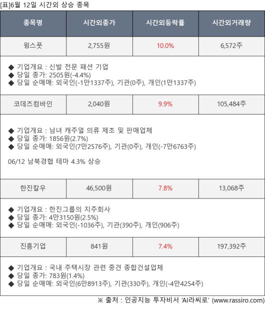 [서울=뉴스핌] 로보뉴스 = 6월 12일, 인공지능 투자비서 ‘AI라씨로’는 시간외 단일가 매매에서 크게 상승한 윙스풋(335870), 코데즈컴바인(047770) 등에 대해 최근 동향을 분석했다.
