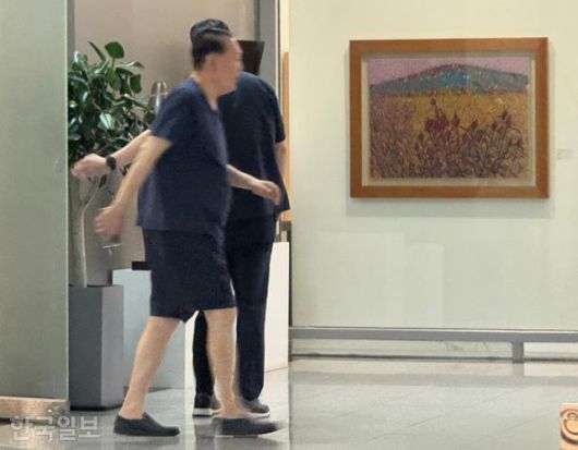 윤석열 전 대통령에 대한 경찰 특별수사단의 2차 출석 요구일인 12일 오전 윤 전 대통령이 소환 통보에 응하지 않은채 반바지 차림으로 경호원들과 서울 서초구 아크로비스타 상가를 활보하고 있다. 남동균 인턴기자 |