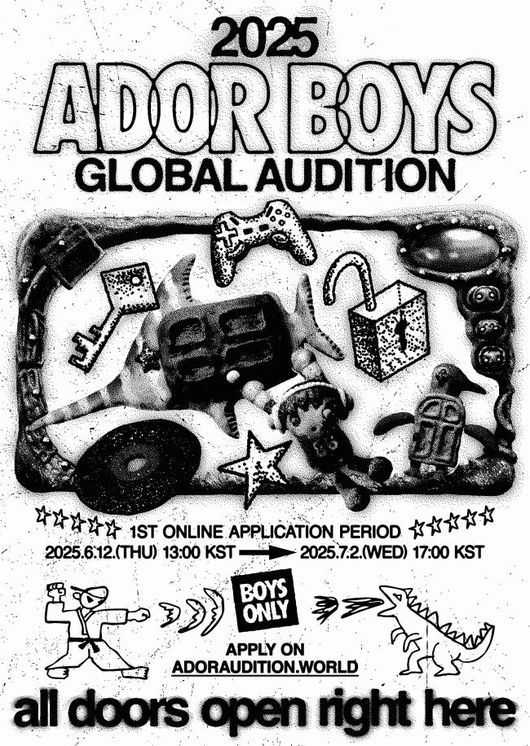 어도어는 12일 공식 홈페이지 및 SNS 채널에 ‘2025 ADOR BOYS GLOBAL AUDITION(2025 어도어 보이즈 글로벌 오디션)’ 개최 공지를 게재했다. ‘All Doors Open Right here’이라는 부제가 붙었다. ‘도전과 기회의 문이 열린다’는 뜻이다.