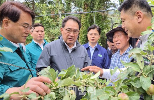 [이데일리 김태형 기자] 지준섭(가운데) 농협중앙회 부회장이 12일 경북 청도 우박 피해 농가를 찾아 피해 농업인을 위로하고, 피해상황 점검하고 있다.