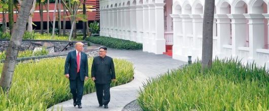트럼프 미국 대통령과 김정은 북한 국무위원장이 2018년 싱가포르에서 정상회담을 한 뒤 산책하고 있다. 싱가포르 정보통신부 제공 |