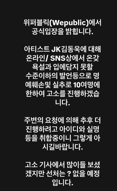 JK김동욱은 12일 자신의 계정을 통해 소속사 공식입장을 함께 전했다. 그는 "아티스트 JK김동욱에 대해 온라인상에서 온갖 욕설과 입에 담지 못할 수준 이하의 발언 등으로 명예훼손 및 실추를 한 10여 명에 한해 고소를 진행하겠다"고 밝혔다.