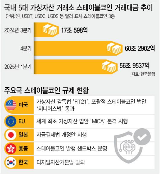 [이데일리 송주오 기자] 실질적 가치가 없다고 평가받던 암호화폐가 실물경제에서 결제수단으로 활용되기 시작했다. 변동성을 최소화한 스테이블코인을 통해서다. 이에 각국은 관련 법을 마련하며 스테이블코인 육성에 나서고 있다. 우리나라도 최근 ‘디지털자산기본법’을 발의하면서 원화 기반 스테이블코인 생태계 구축을 위한 첫발을 뗐다.