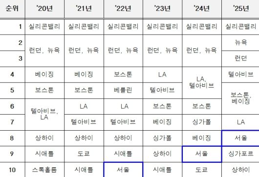2022년 글로벌 창업도시 톱10에 처음으로 진입한 서울은 국내 투자시장이 위축되면서 이듬해 12위까지 순위가 밀렸지만 지난해 9위로 반등에 성공했다. 아시아 대표 창업 도시로 손꼽히는 싱가포르(9위)와 도쿄(11위)를 제치고 선순위를 기록했다는 점에서 그 의미는 더욱 크다.