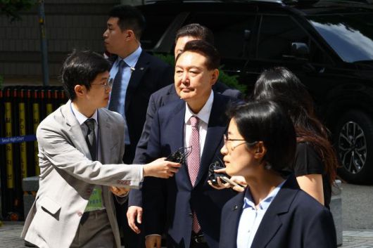 윤석열 전 대통령이 지난 9일 서울중앙지방법원에서 열린 내란 우두머리·직권남용 권리행사 방해 혐의 사건 6차 공판에 출석하고 있다. 사진공동취재단 |