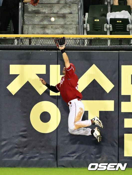 [OSEN=잠실, 지형준 기자] 12일 오후 서울 잠실구장에서 ‘2025 신한 SOL Bank KBO리그’ LG 트윈스와 SSG 랜더스의 경기가 열렸다. LG는 치리노스, SSG는 전영준을 선발로 내세웠다 5회말 2사 1,3루에서 SSG 한유섬이 LG 박동원의 역전 2타점 적시 2루타에 점프 캐치를 시도했지만 놓치고 있다. 2025.06.12 /jpnews@osen.co.kr