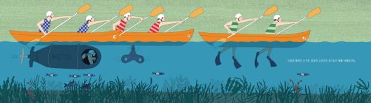 반칙을 해서라도 이기려고 난리법석인 결승선 근처에 눈치 없는 낚시꾼이 나타나 슬렁 낚싯대를 던진다. 선두 카누를 끌던 물고기들이 낚싯줄 끝에 달린 지렁이를 보더니 급발진을 한다. 배는 뒤집어진다. 뒤따르던 배들도 ‘쿵쿵’ 연쇄추돌을 일으킨다. ‘첨벙’ ‘어이쿠’ 선수들과 카누들이 엉킨다. 우승만은 놓치고 싶지 않았던 선수들은 뒤집히지 않은 카누 한 대에 우르르 오르며 서로 “내가 일등이라고!”를 외친다. 대회 주최 측은 누구에게 상을 줘야 할지 난감하다. 결국 선수들은 선수 수만큼 쪼개진 메달 조각을 받게 된다.