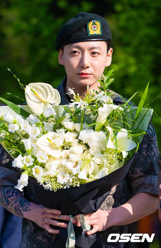 [OSEN=연천, 박준형 기자] 그룹 방탄소년단(BTS)의 지민과 정국이 11일 1년 6개월 간의 군 복무를 마치고 전역했다.지민과 정국은 지난 2023년 12월 육군 현역으로 동반입대해 육군 5사단 포병여단에서 복무해왔다. 팀의 맏형 진은 작년 6월, 제이홉은 작년 10월,RM과 뷔는 전날 각각 전투복을 벗었다. 슈가는 21일 소집해제를 앞두고 있다. BTS 정국이 꽃다발을 안고 포즈를 취하고 있다. 2026.06.11 / soul1014@osen.co.kr |