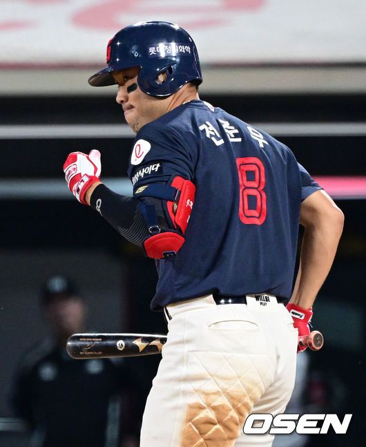 [OSEN=수원, 조은정 기자]12일 오후 수원 KT위즈파크에서 ‘2025 신한 SOL Bank KBO리그’ KT 위즈와 롯데 자이언츠의 경기가 열렸다.이날 홈팀 KT의 선발투수는 소형준, 방문팀 롯데는 김진욱이 나선다.3회초 2사 3루 전준우가 적시타를 날린 뒤 세리머니를 하고 있다. 2025.06.12 /cej@osen.co.kr |