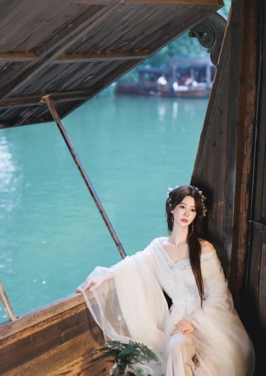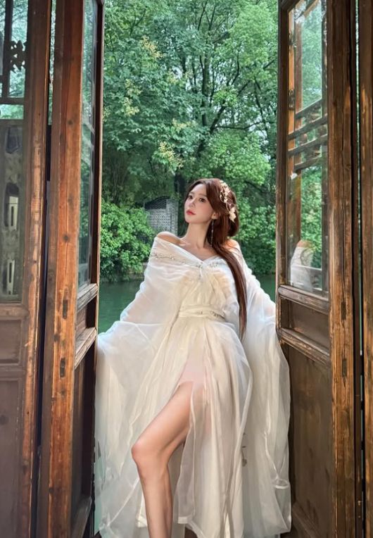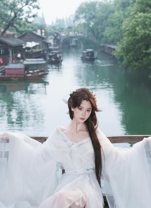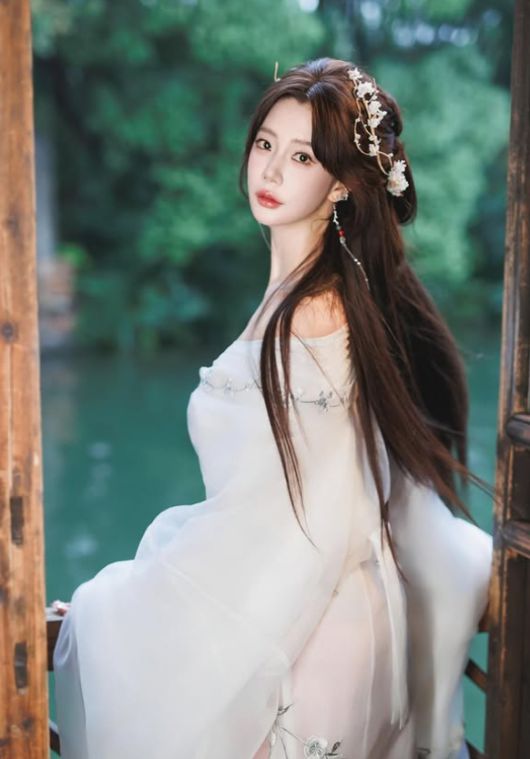 그는 흰색 드레스를 입고 긴 웨이브 헤어스타일에 꽃 장식 핀으로 포인트를 주었으며, 중국 전통 우산을 들고 아름다움을 극대화했다. 특히 뚜렷한 이목구비와 무결점 피부는 실사판 선녀를 떠오르게 한다.