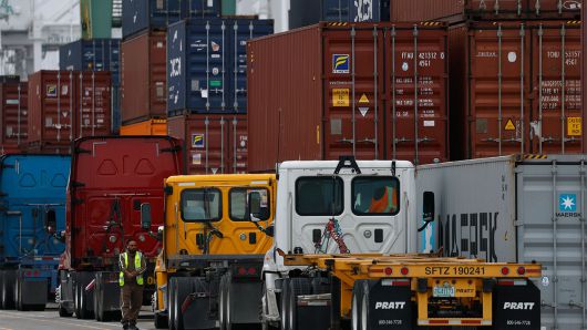 ▲ 미국 캘리포니아주 오클랜드항에서 컨테이너를 싣기 위해 기다리는 트럭들