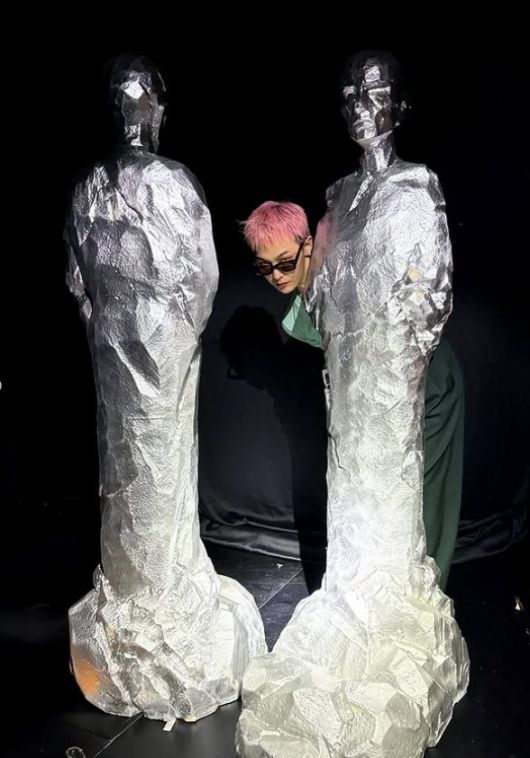 또한, 투어 백스테이지로 보이는 곳에서는 검은색 플리스 로브와 화려한 패치가 달린 모자, 노란색 틴트 선글라스로 편안하면서도 힙한 스타일을 연출했다. 은색 조형물 사이에서 포즈를 취한 사진은 그의 예술가적인 감각을 엿보게 한다.
