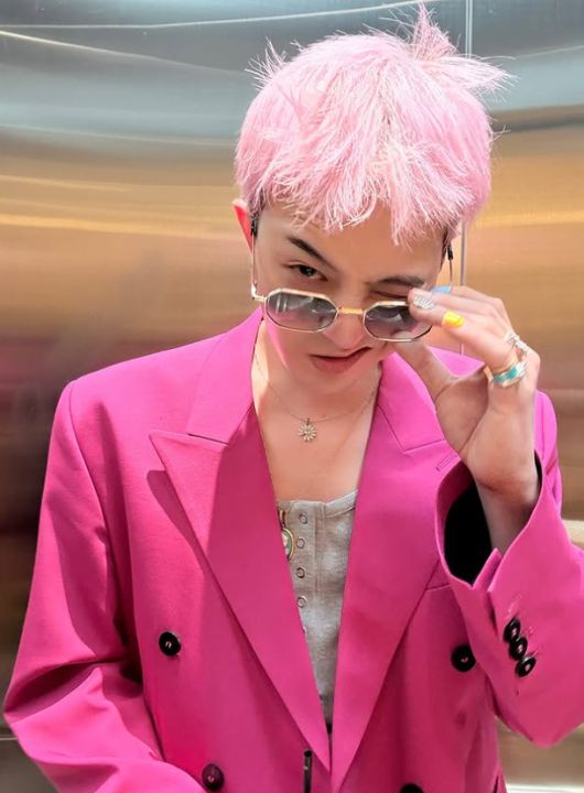 사진에서 지드래곤은 강렬한 핑크색 헤어스타일을 바탕으로 다채로운 스타일링을 선보였다.