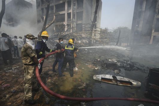 인도 소방대원들이 12일 구자라트주 아마다바드의 에어 인디아 AI-171편 보잉 여객기 추락 현장에서 화재를 진압하고 있다. AP/연합뉴스 |