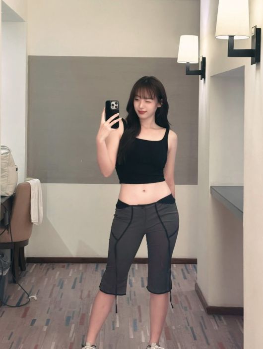 또 다른 사진에서는 흰색 크롭 탑과 앞서 착용한 그레이 반바지를 다시 매치해 시원하면서도 캐주얼한 분위기를 연출했다. 편안한 스타일 속에서도 스타일리시한 매력을 발산했다.