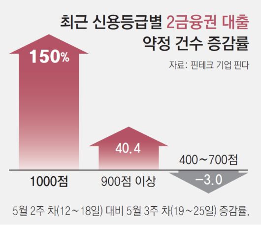 12일 핀테크 기업 핀다에 따르면 5월 3∼4주 차(5월 12∼25일) 동안 사용자들의 대출 현황을 분석한 결과 신용점수 900점 이상인 고신용자가 받은 2금융권 대출 약정 수는 3단계 스트레스 DSR 시행방안이 발표됐던 5월 4주 차(5월 19∼25일)에 전주(5월 12∼18일) 대비 40.4% 급증한 것으로 나타났다. 같은 기간 대출 약정액은 31.7% 늘었다. 신용점수 1000점인 ‘만점자’들의 2금융권 대출 약정 건수와 약정금액도 각각 150%, 600% 급증했다.