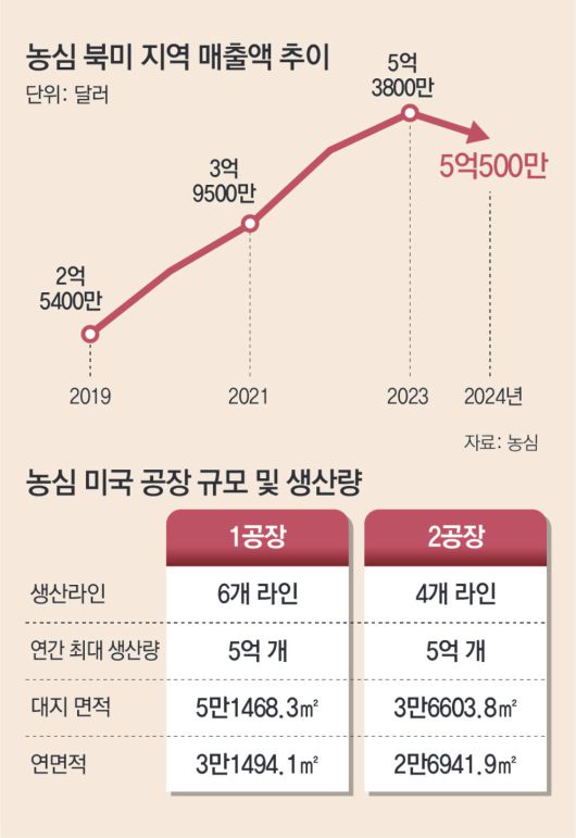 미국 진출 반세기 만에 농심은 현지에서 K라면을 연간 10억 개 생산할 수 있는 회사로 성장했다. 현재까지 농심이 미국 시장에 투자한 돈은 3억 달러(약 4100억 원)이다. 농심의 미국 시장 매출액은 지난해 5억500만 달러로, 20년 전 4170만 달러(2005년)에서 12배 이상으로 증가했다. 2017년 국내 식품사 최초로 미국 전역의 월마트 점포에 제품을 넣기 시작했고, 2018년부터는 월마트를 비롯해 코스트코 등 현지 유통점에서 나오는 매출이 아시안 마켓을 앞질렀다.