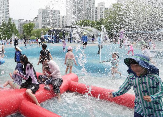 7일 경기 부천시 원미구 중동에 있는 중앙공원을 찾은 시민들이 시원하게 물놀이를 즐기고 있다. 부천시 제공 |