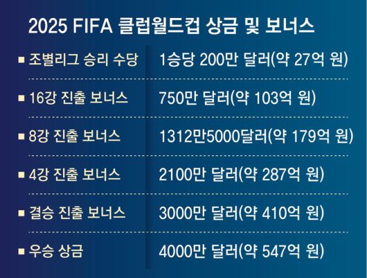 대회 규모가 확대되면서 상금도 대폭 올랐다. 이번 대회 총상금은 2022 카타르 월드컵 총상금(4억4000만 달러·출전료 포함)의 두 배가 넘는 10억 달러(약 1조3600억 원)다. 대회 정상에 오르면 우승 상금 4000만 달러와 각종 보너스를 합쳐 최대 1억2500만 달러(약 1700억 원)를 벌게 된다. 잔니 인판티노 FIFA 회장은 “이번 대회와 같은 방식으로 열렸던 과거 대회들을 뛰어넘는 역사상 최고 상금(보너스 포함)이다”라고 말했다.