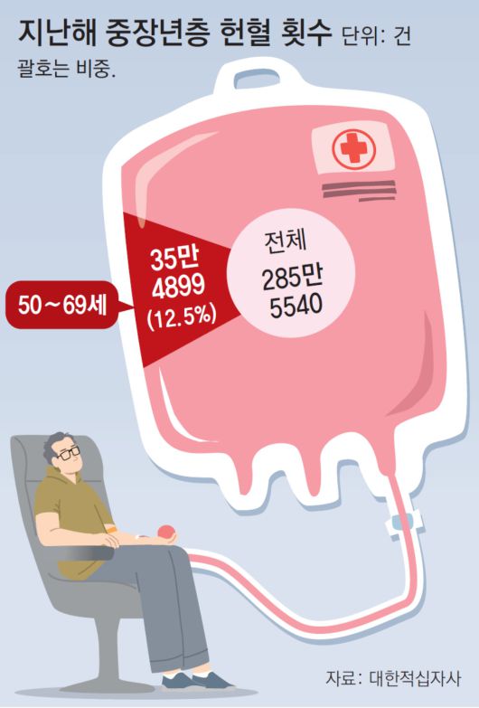 대한적십자사 혈액관리본부에 따르면 지난해 국내 헌혈은 285만5540건이었다. 이 가운데 35만4899건(12.5%)은 50∼69세 중장년층 헌혈이었다. 전체 헌혈에서 이 연령대가 차지하는 비율은 2005년 1.2%에 그쳤으나 19년 만에 10배 이상으로 늘었다.