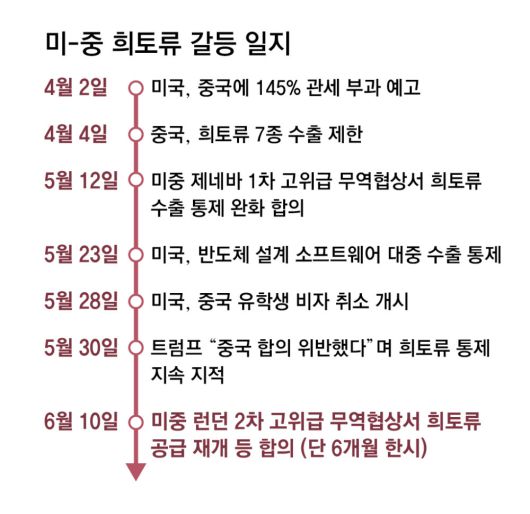 하지만 중국이 전기차 배터리, 스마트폰 등 각종 첨단 기기에 꼭 필요한 ‘핵심 희토류 7종’에 대한 수출 통제를 본격화하자 트럼프 2기 행정부의 속내가 다급해졌다. 희토류 부족으로 미국 주요 자동차 기업들이 생산에 어려움을 겪는 등 피해가 가시화됐기 때문이다.