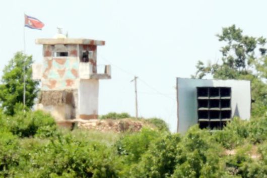 [ 12일 경기 파주시 자유로에서 바라본 북한 대남 방송 스피커 옆 초소에서 북한군이 경계 근무를 하고 있다. 이날 합동참모본부는 "북한의 대남 소음 방송이 청취되지 않고 있다"고 밝혔다. 전날 우리 군이 대북 확성기 방송을 중단한 데 대한 조치로 풀이된다. 파주=연합뉴스