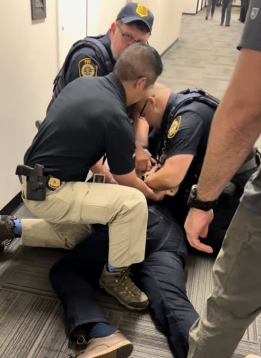 이 모습을 담은 영상에는 3명의 요원이 그를 바닥에 던지고 그의 등 뒤로 손에 수갑을 채우는 장면이 담겼다.