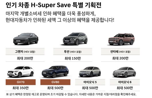 현대차는 인기 차종을 대상으로 할인을 제공하는 ‘H-슈퍼 세이브’ 특별 기획전을 진행하고 있다. 주력 전기차 모델 아이오닉5와 아이오닉6는 최대 500만 원, 인기 모델 그랜저와 싼타페는 최대 200만 원의 할인 혜택이 주어진다. 기아도 생산 월별 등을 고려해 K5를 구매한 고객에게 최대 230만 원, K8을 구매한 고객들에게는 최대 330만 원의 할인 혜택을 제공한다.