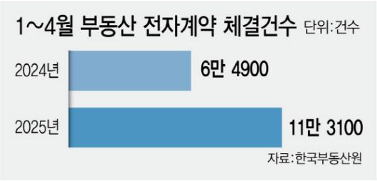 12일 한국부동산원에 따르면 올해 1~4월 중개 거래 전자계약 체결건수는 11만3100여 건으로 지난해 동기(6만4900여 건) 대비 74% 늘었다. 지난달과 이번달 거래량이 증가세를 보이는 만큼 더 많은 전자계약이 체결됐을 것이라는 게 업계 추정이다. 또 올해 1~4월 전체 부동산 거래에서 전자계약이 차지하는 비율은 8.37%로 전년(5.95%) 대비 활용률이 41% 상당 증가했다.