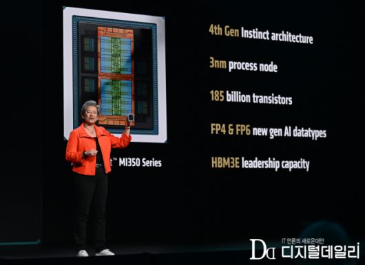 12일(현지시각) AMD(대표 리사 수)는 미국 새너제이에서 개최한 ‘어드밴싱 AI 2025(AAI 2025)’ 행사에서 MI350 시리즈에 HBM3e 12H D램이 탑재됐다고 발표했다. 이날 AMD는 이번 MI350 시리즈 HBM 공급사로 삼성전자와 마이크론을 지목했다.