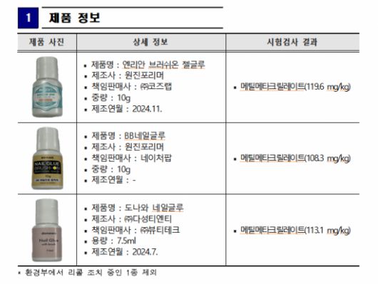또 국내 제조사가 생산한 제품 4종 가운데 환경부 리콜을 실시하고 있던 1종을 제외하고, 원진포리머와 다성티엔티 등 2개 제조사에서 생산한 엔리안 브러쉬온 젤글루, BB네일글루, 도나와 네일글루 등 제품 3종에 대해 법·기준 위반 통보와 시정조치를 요청했다. 이들 사업자는 즉시 판매를 중단하고, 재고 폐기와 판매 제품에 대한 환불 등을 실시하기로 했다.