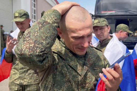 12일(현지시간) 러시아 국방부 공보국이 공개한 영상 일부. 러시아와 우크라이나 간 포로 교환을 통해 귀환한 러시아 군인들이 벨라루스의 교환소에서 기념 사진을 촬영하고 있다. 2025.6.12 AP 연합뉴스(러시아 국방부) |