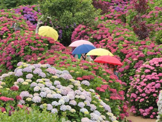제주도에 이른 장마가 시작된 지난 12일 오전 제주 서귀포시 안덕면의 한 카페를 찾은 관광들이 우산을 쓰고 산책하고 있다. 〈사진=연합뉴스〉 |