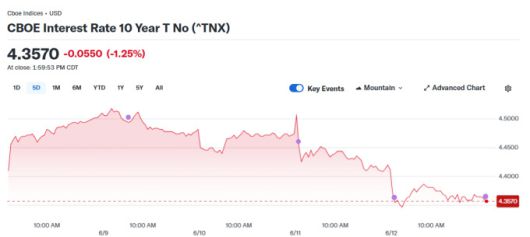 [서울=뉴스핌] 고인원 기자= 미국 국채 금리가 12일(현지시간) 4거래일 연속 하락했다. 노동시장 둔화 조짐과 생산자물가 상승률이 예상보다 낮게 나타난 가운데, 트럼프 대통령의 무역 정책 불확실성과 중동 지정학적 긴장 고조가 겹치며 투자자들이 채권 등 안전자산으로 몰렸다.